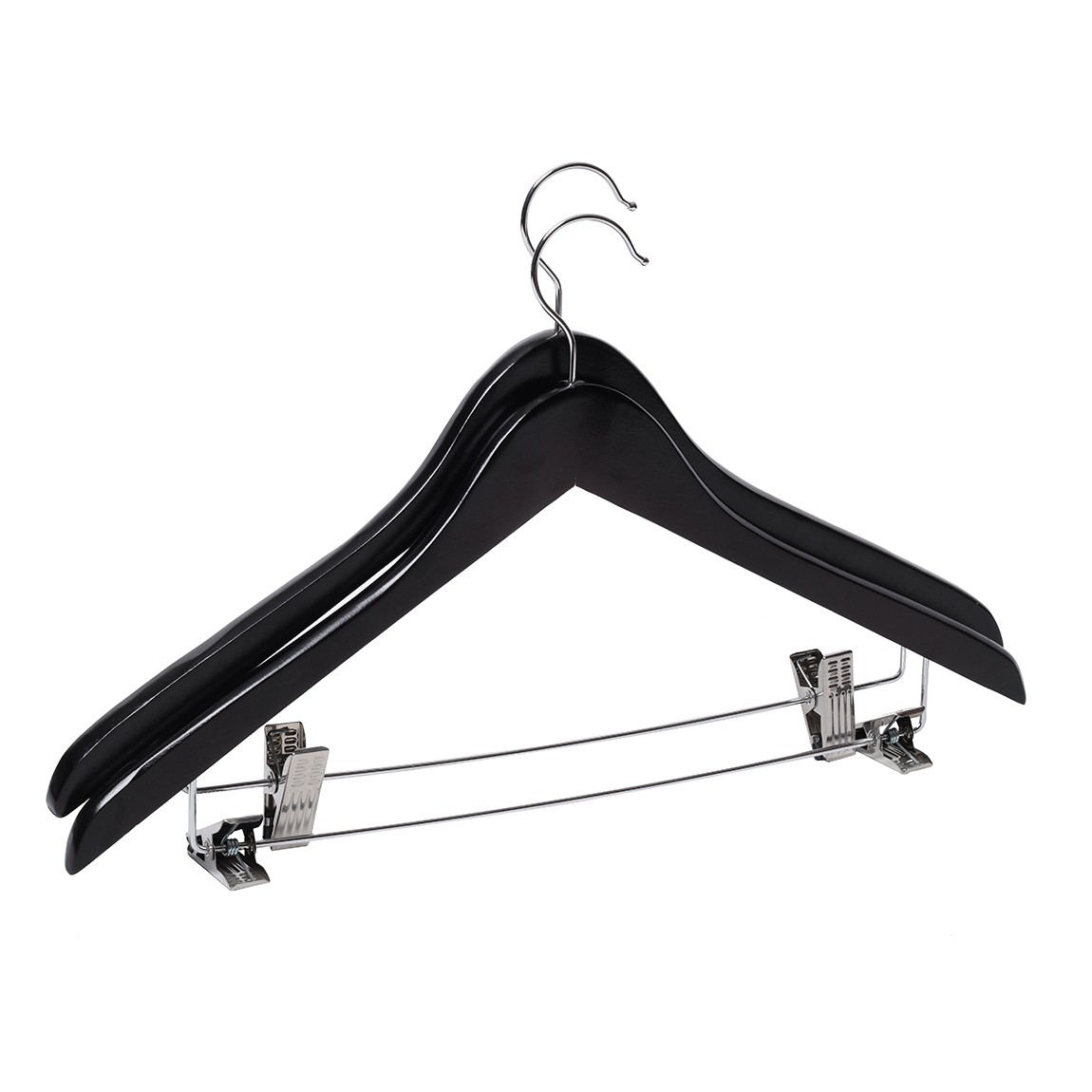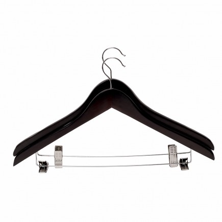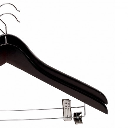 Gancho para blusa y falda marca Better Space en madera nogal con pinzas.